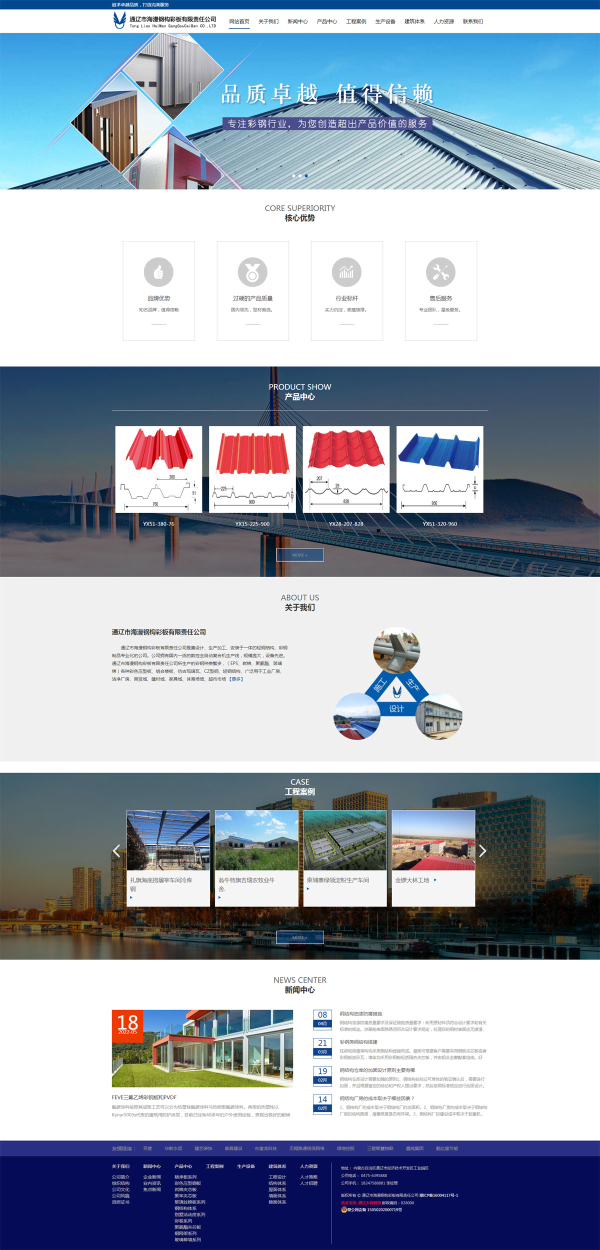 公司擁有國內(nèi)一流的數(shù)控全自動復(fù)合機生產(chǎn)線,規(guī)模龐大,設(shè)備先進。 通遼市海漫鋼構(gòu)彩板有限責(zé)任公司所生產(chǎn)的彩鋼種類繁多,(EPS、巖棉、聚氨酯、玻璃棉)各種彩色壓型板、組合樓板、仿古琉璃瓦、CZ型鋼、輕鋼結(jié)構(gòu)、廣泛用于工業(yè)廠房、潔凈廠房、商貿(mào)城、建材城、家具城、體育場館、超市市場、大型廳館、樓房接層、鋼結(jié)構(gòu)住宅、別墅、冷庫、保溫保鮮氣調(diào)庫、室內(nèi)外裝飾、樓板、高檔活動房、建筑圍擋等。該產(chǎn)品色彩鮮艷、造型美觀流暢、彩涂堅固耐久、使用壽命長、耐腐蝕、防水性能好,深受廣大用戶歡迎,產(chǎn)品暢銷全國‘公司擁有一批專業(yè)的工程師,設(shè)計師和熟練的技術(shù)隊伍,并擁有現(xiàn)代化的管理機構(gòu)。我們承諾免費為用戶設(shè)計、咨詢彩鋼、輕鋼工程的安裝繪圖,并承攬各種工程安裝。