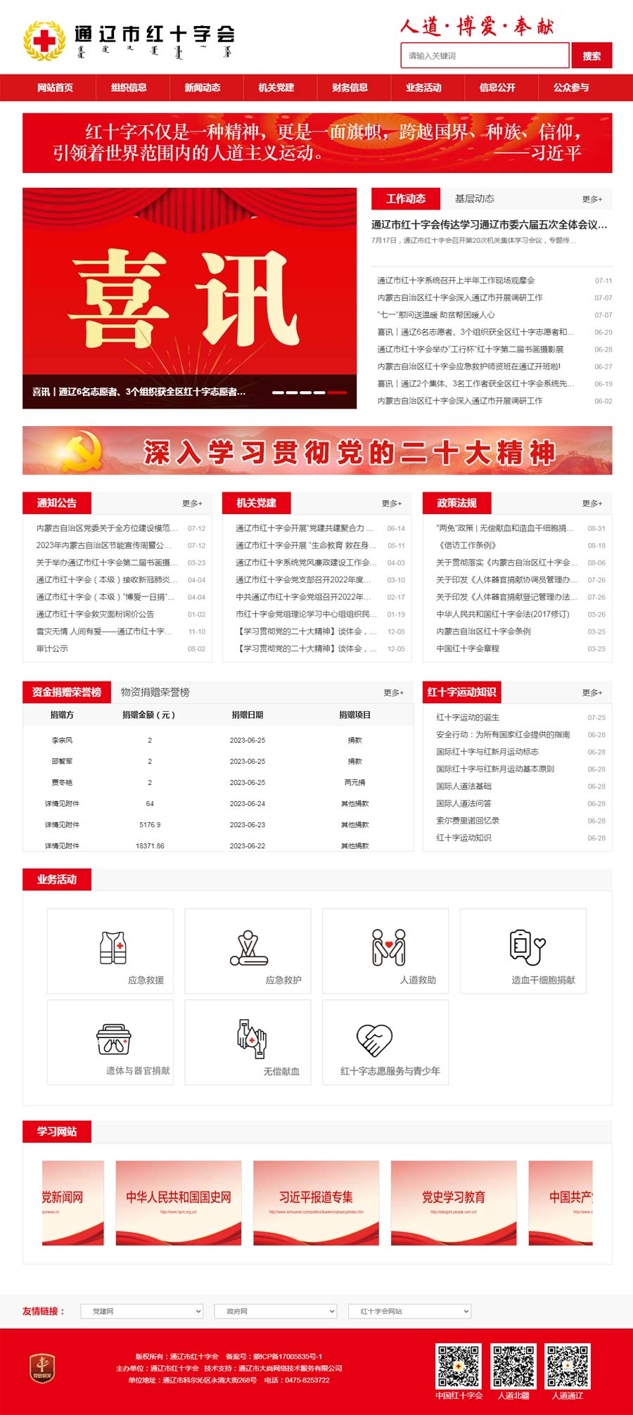 近年來,通遼市紅十字會(huì)在市委、市政府堅(jiān)強(qiáng)領(lǐng)導(dǎo)和自治區(qū)紅十字會(huì)的正確指導(dǎo)下,各項(xiàng)工作取得了長(zhǎng)足發(fā)展。全市紅十字會(huì)系統(tǒng)年度籌資穩(wěn)定在1000萬(wàn)元以上,8個(gè)旗縣市區(qū)全部突破100萬(wàn)元,市本級(jí)多年穩(wěn)定在200萬(wàn)元以上;自治區(qū)紅十字會(huì)“十四五”規(guī)劃重點(diǎn)項(xiàng)目建設(shè)高質(zhì)量推進(jìn),實(shí)施總會(huì)和自治區(qū)“博愛家園”項(xiàng)目,推進(jìn)建設(shè)紅十字示范校、應(yīng)急救護(hù)角、應(yīng)急救護(hù)點(diǎn)、人道文化傳播點(diǎn)、人道文化傳播基地、志愿者服務(wù)基地等重點(diǎn)項(xiàng)目;持續(xù)開展“博愛送萬(wàn)家”“大病救助”“資助貧困學(xué)生”“光明行”等社會(huì)救助和公益活動(dòng),市紅十字會(huì)的社會(huì)影響力和公信力逐步提升,聯(lián)系服務(wù)群眾的橋梁紐帶作用和人道領(lǐng)域助手作用顯著增強(qiáng)。